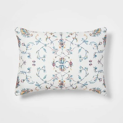 Create a refreshing, restful retreat in your bedroom with the Ancora Border Print Comforter Bedding Set from Threshold™. The stylish comforter is adorned with a pattern of paintbrush florals in blue, pink and yellow shades on a textured white background for an inviting accent to brighten up your room. A square and a rectangular decorative pillow with an embroidered or solid white design, as well as one or two matching pillow shams, coordinate with the top of the bed for a cohesive look. This bedding set is made from a lightweight fabric for soft, cozy comfort, and both the comforter and sham are machine-washable for easy cleaning. Pair it with cream bedsheets to enhance the clean, sophisticated look, and toss on throw pillows in coordinating colors to finish a lovely sleeping setting.